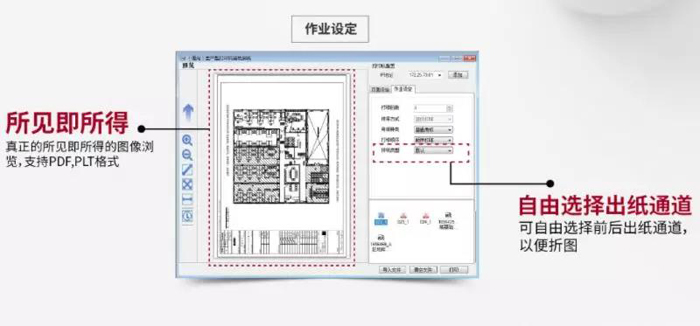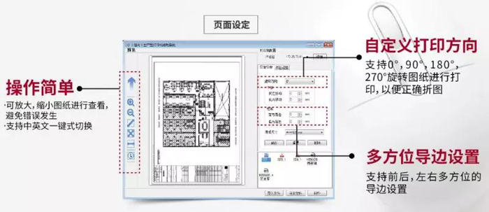 简单易用 客户端免驱动和批量打印工具,简单易用,方便给非专业出图人员使用 印前处理可增减空白区域,处理扫描文件和不规则文件,大幅减少人员裁图,提高印前文件处理效率 文件兼容 支持处理PDF、PLT文件自定义打印 自定义打印方向,支持0°、90°、180°、270°旋转图纸进行打印,以便正确折图 自由选择 自由选择出纸通道,可自由选择前后出纸通道,大幅减少人员二次处理,提高工作效率